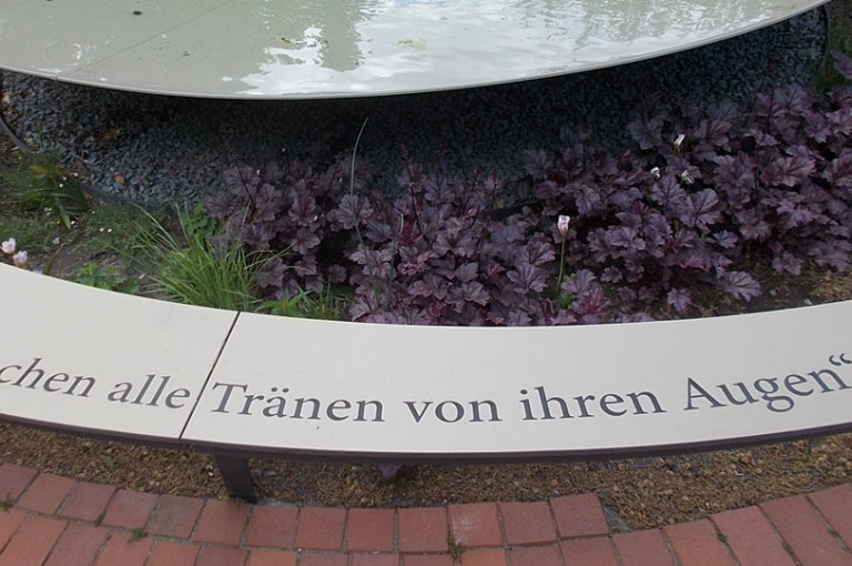 Aus der Offenbarung 21,4 Neues Testament wurde der Auszug: „...und Gott wird abwischen alle Tränen von Ihren Augen“ in den Sitzring eingraviert.
