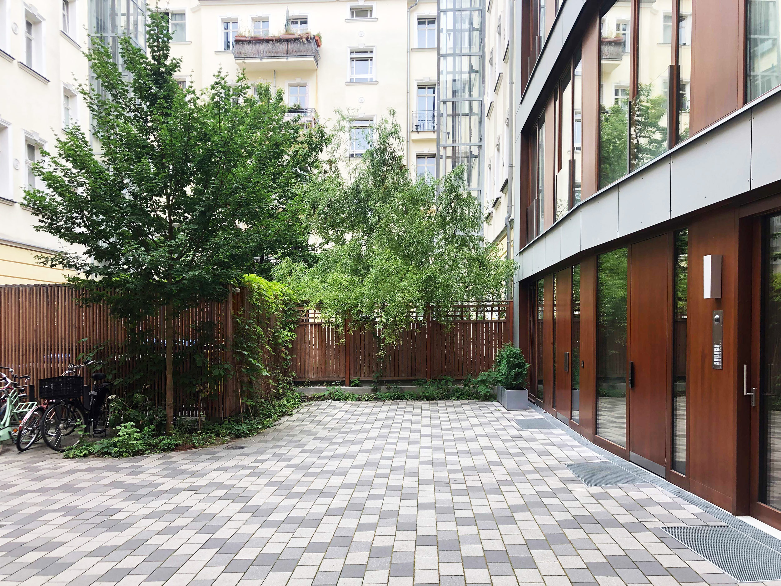 Die bauliche Ergänzung einer Remise im Hinterhof ermöglichte die Neustrukturierung der Freiflächen im Hof sowie die Neuanlage des Gartenteils. Dieser befindet sich in unmittelbaren Übergang zur Spielfläche einer Kindertagesstätte.