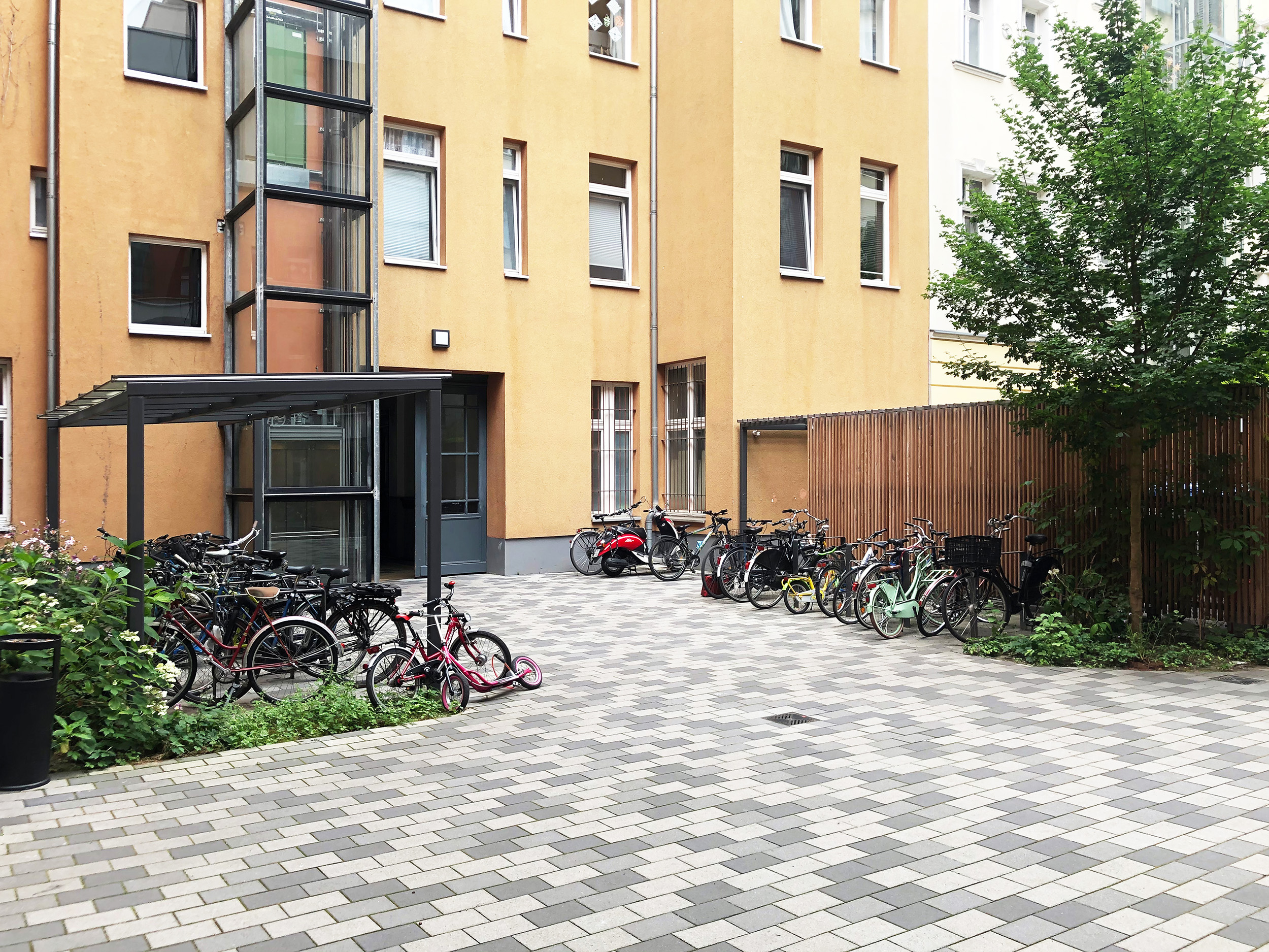 Die Entsorgungsstation erhält eine neue Einhausung. Der Hof wird mit der Pflanzung eines Ahornbaumes akzentuiert (Acer campestre). Die Oberfläche wurde aus Betonsteinpflaster mit Natursteinvorsatz hergestellt. Neben der Einhausung wurden Fahrradbügel angeordnet.