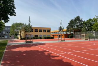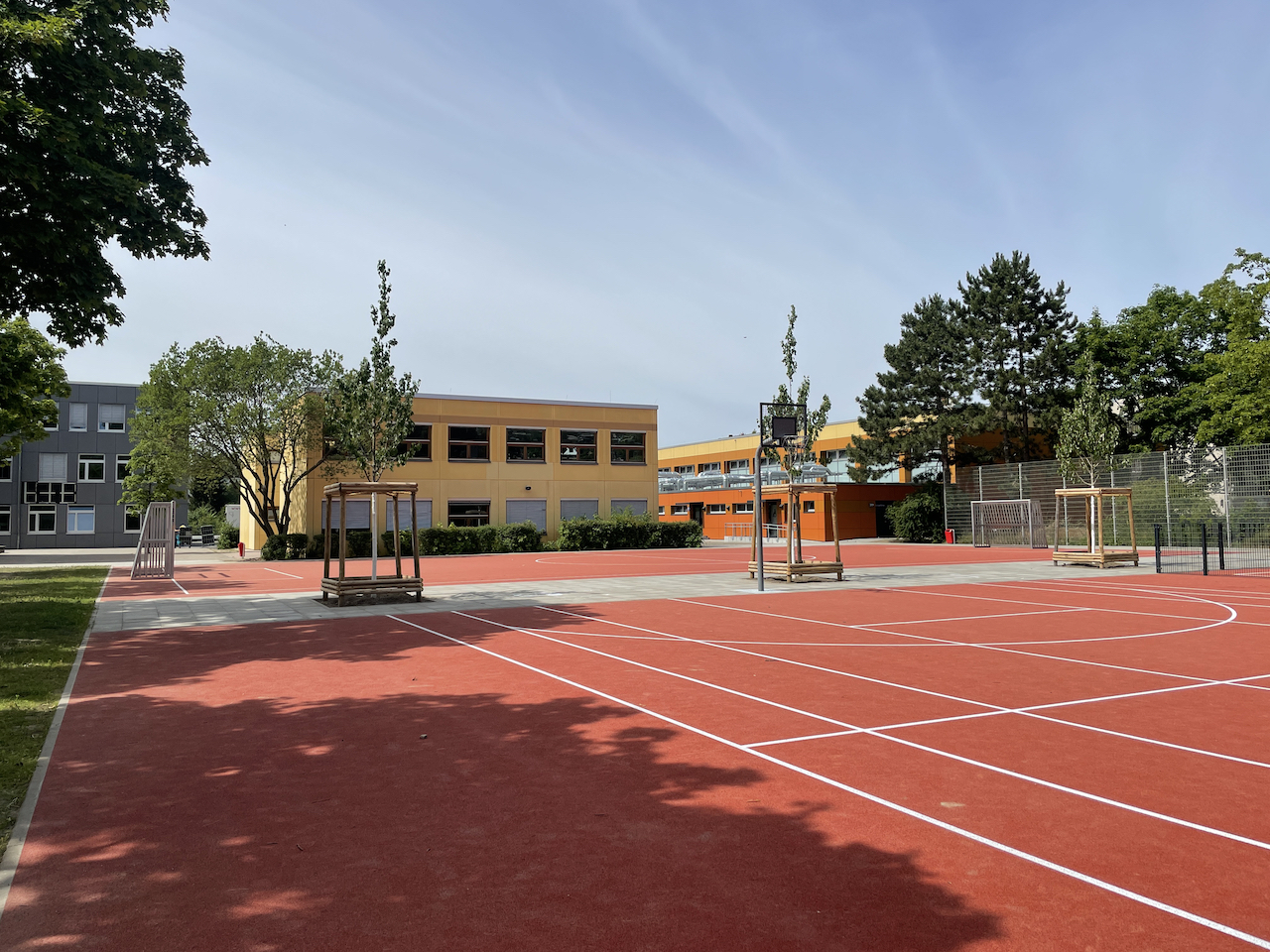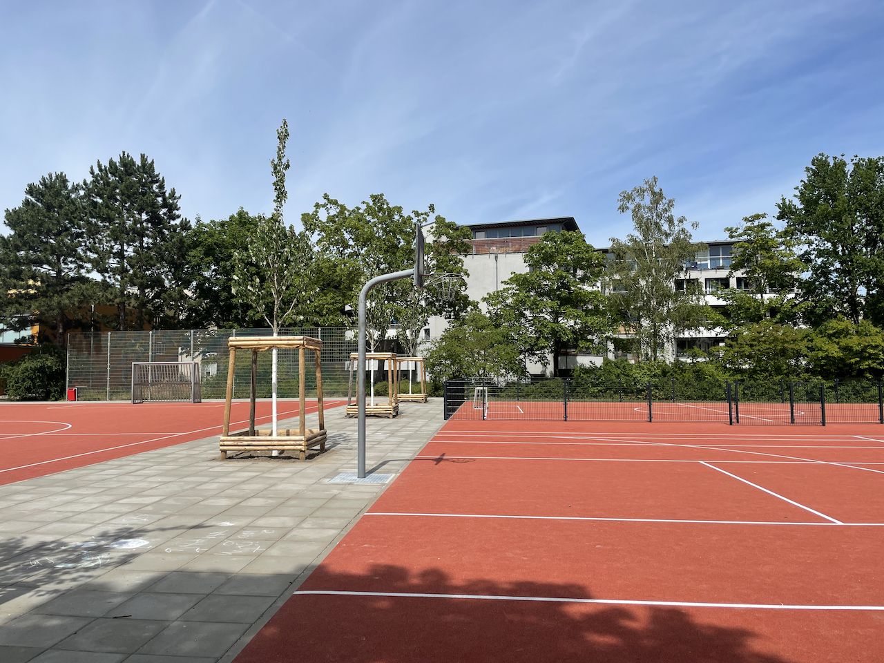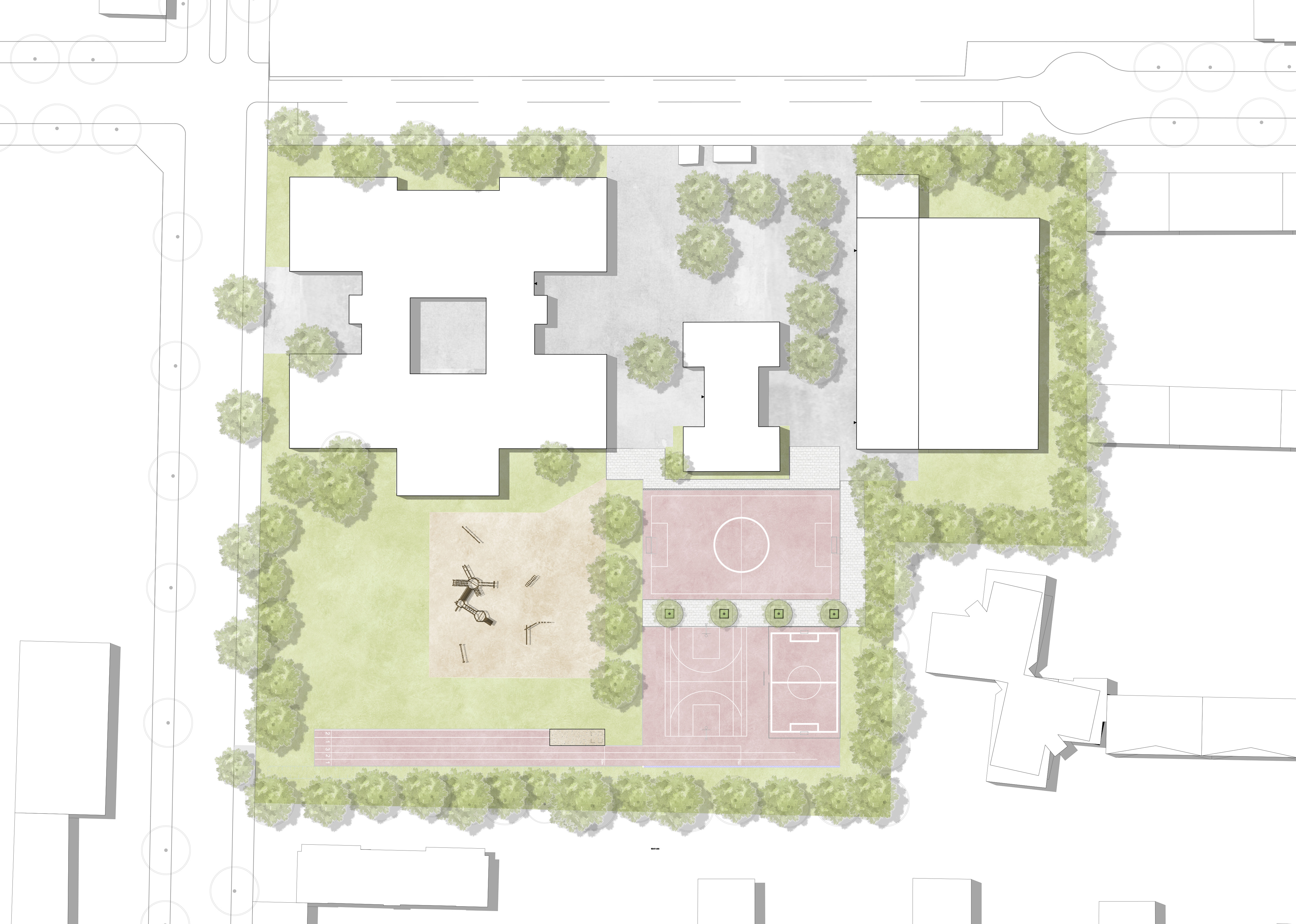 Die Planungsleistungen beinhalten die Neustrukturierung der Sportflächen, sodass wieder ein sicherer Schulbetrieb stattfinden kann. Das Ziel des Entwurfs ist, eine klare Lesbarkeit und Bespielbarkeit der neu geschaffenen Flächen zu bewirken. Durch das unterschiedliche Alter der Schüler*innen werden die Spielflächen multifunktional besetzt. Durch Markierungen werden die Spielflächen geordnet und definiert.