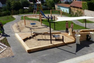 Den südlichen Abschluß bildet ein Spielhügel. Große, schattenspendene Bäume begleiten die Spielterrasse und den Sandspielbereich. Im Bereich der Obstbäume können die Kinder mit verschiedenen Materialien experimentieren.