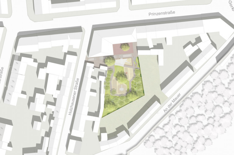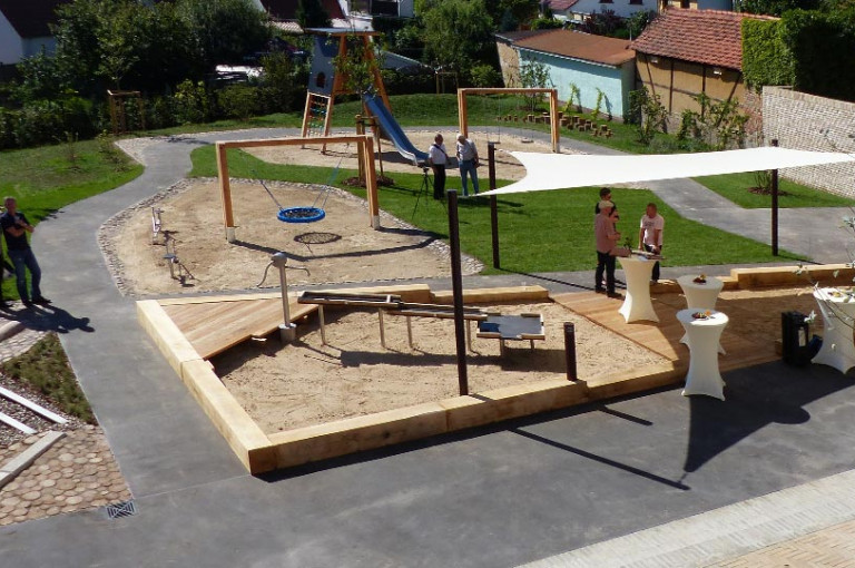 Die Kindertagesstätte erhält einen großen Garten von ca. 1.200qm. Ausgangspunkt ist die neue große, südliche Terrasse vor dem Bestandsgebäude. Sie nimmt die südliche Flucht des Neubaus auf und vermittelt zugleich die unterschiedlichen Höhen zwischen Altbau und umgebenden Terrain. Der Garten selbst wird in unterschiedliche Bereiche gegliedert, die mit verschiedenen Bodenbelägen und Spielgeräten ausgestattet sind. Eine umlaufende Rollerbahn verbindet alle Bereiche.