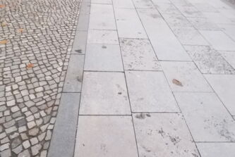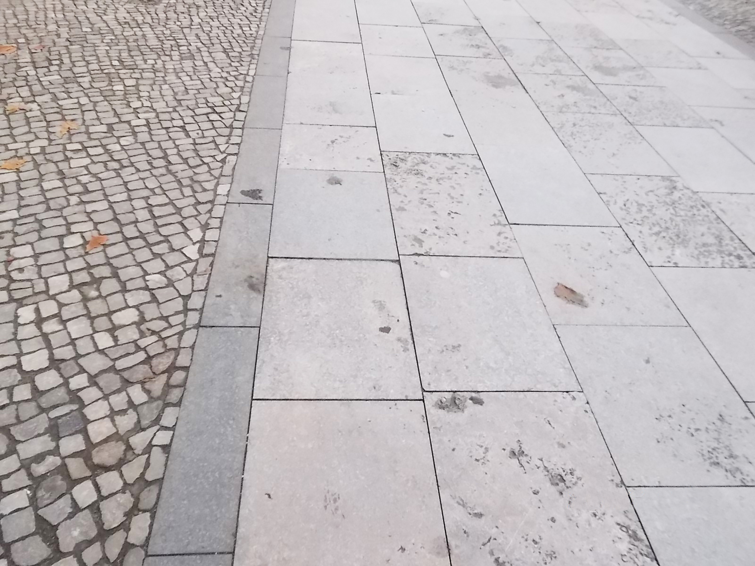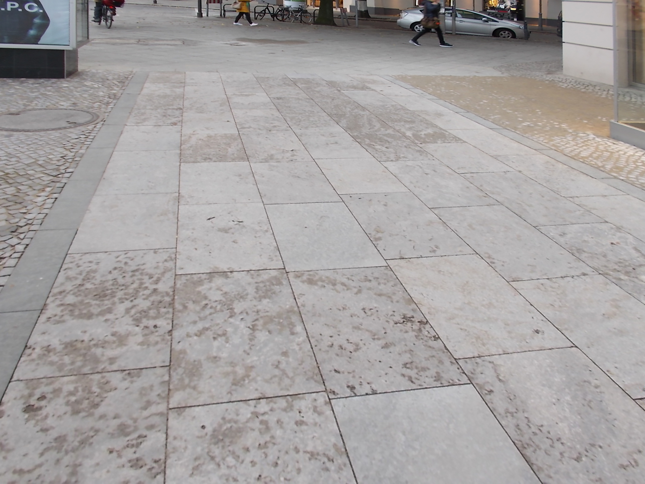 Ein Plattenband aus Natursteinplattten (Muschelkalk) mit einer Breite von 2.80m wurde seitlich durch einen Einzeiler aus dunklen Natursteinplatten (entsprechend Basalt Mosaiksteinpflaster) eingefasst. Analog zum Bestand wurden die Flächen zwischen dem Plattenstreifen und den Vitrinen / dem Gebäude mit Bernburger Mosaiksteinpflaster befestigt.