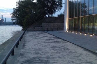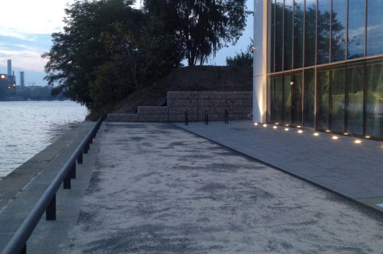 Die Maßnahme umfasst die Herstellung des Freiraums um den Wohnturm, sowie die Herstellung der Uferpromenade entlang der Spree.
