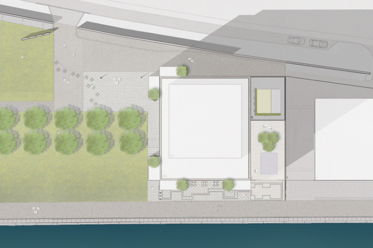 Im Untergeschoss des Wohngebäudes eröffnet ein Cafe. Die Uferpromenade weitet sich in diesem Bereich zu einer Gastro Terrasse auf.