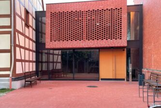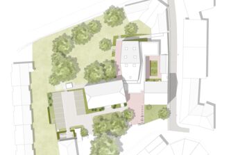 Hauptziel der Planung ist zusammen mit der Herstellung des Neubaus des Gemeindesaals die Neugestaltung der Aussenanlagen. Hier werden die vorhandenen Strukturen der Freiflächen aufgegriffen und durch neue Materialitäten und Bepflanzungen aufgewertet und ergänzt. Das neue Gemeindezentrum erhält einen Vorplatz, der sich in der Oberflächengestaltung von dem Zugang der Kirchenverwaltung abhebt, und die Materialität des Neubaus aufgreift. Neben einer langen Sitzbank werden auch Bügel für Fahrräder vorgesehen.