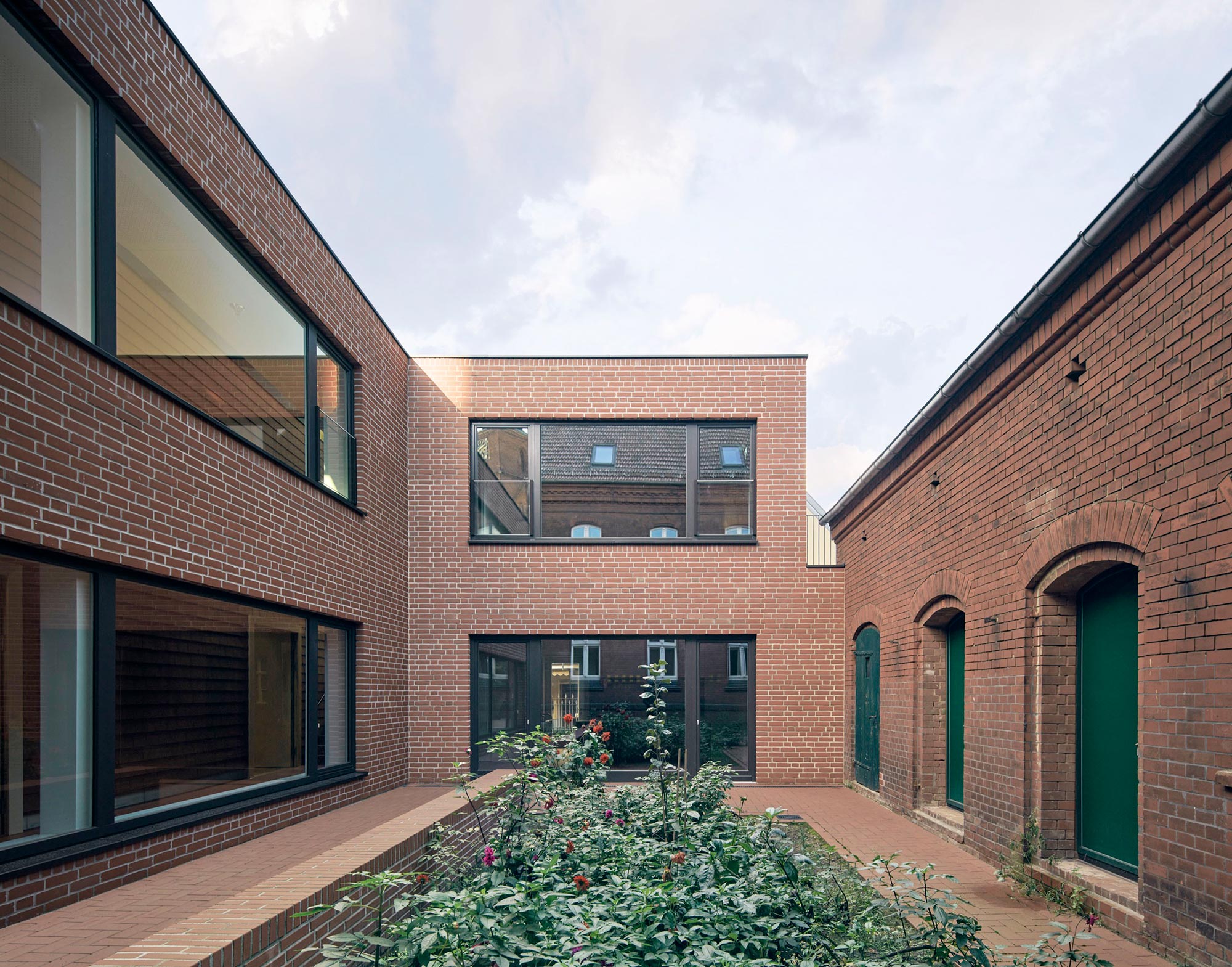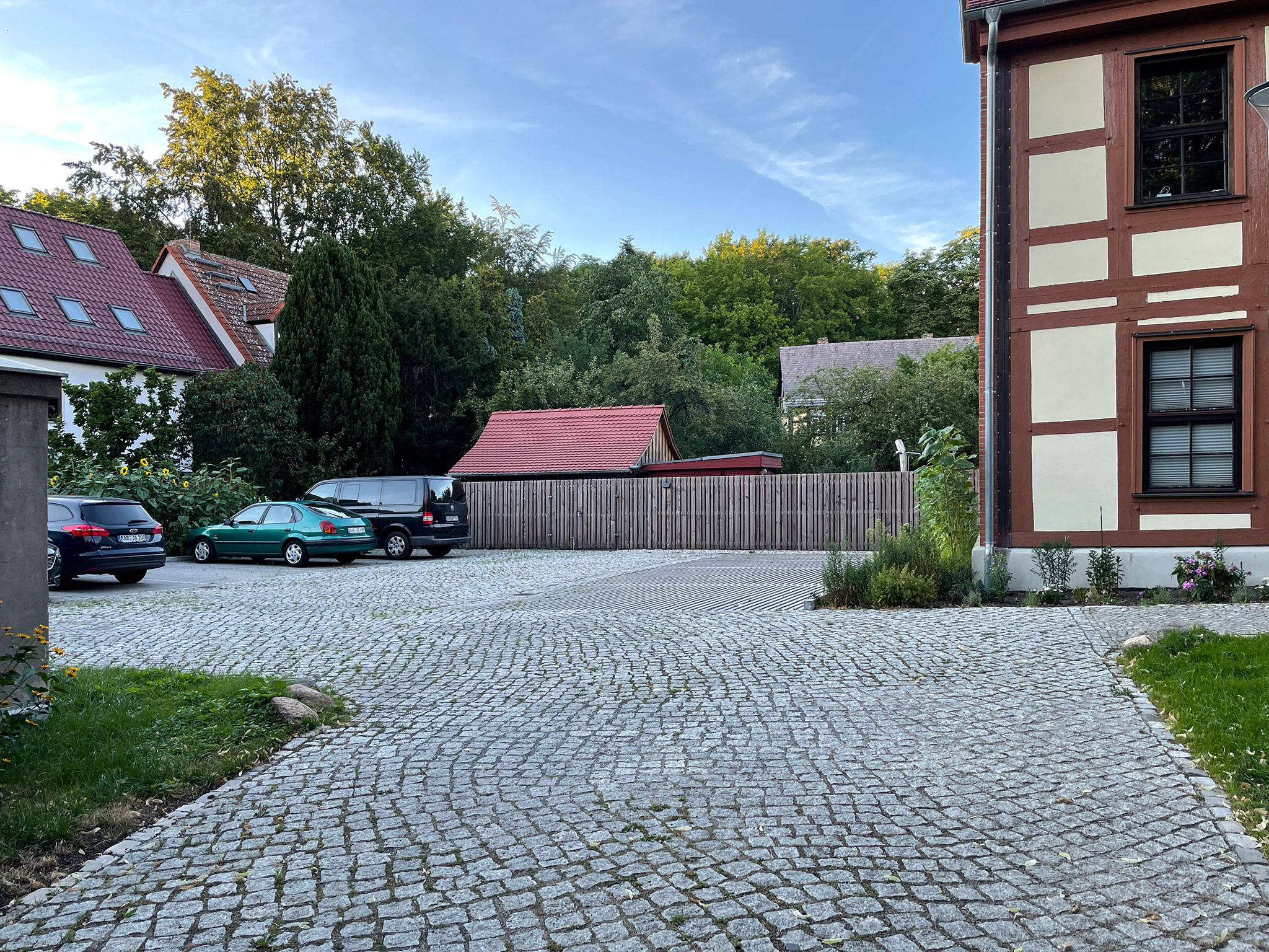 Zusammen mit einem kleinen Patio und der gartenseitigen Terrasse bietet das Ensemble mehrere Orte des Aufenthalts im Freien. Der westliche Grundstücksbereich bietet neben PKW-Stellplätzen auch die Entsorgungsstation sowie den (Privat)Zugang in den Garten.