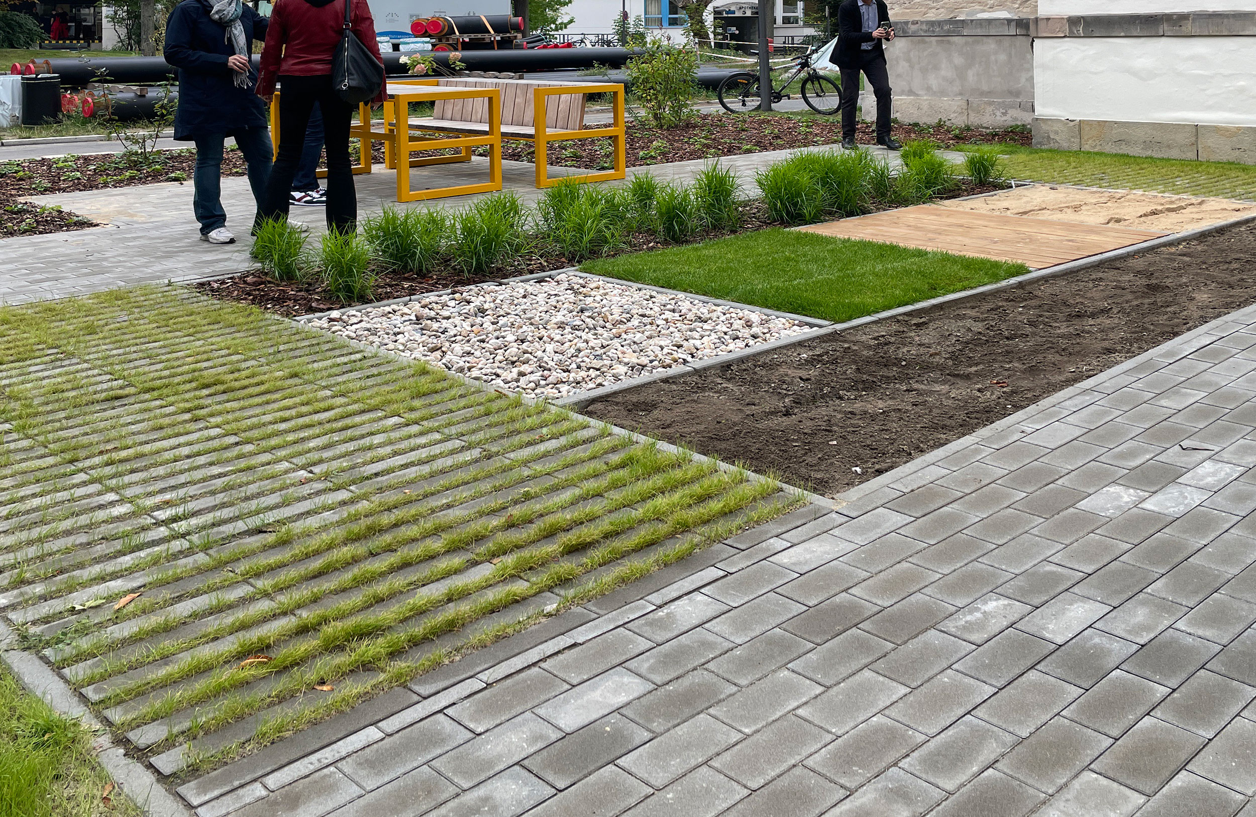 Ziel für Rollstuhlfahrende ist es, mithilfe des Parkours Alltagssituationen in Form unterschiedlichster Barrieren besser meistern zu können. Oberflächen wie Pflaster, Sand, Holz - sowie Bordsteine und Poller sind Bestandteil des Parkours.