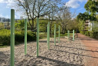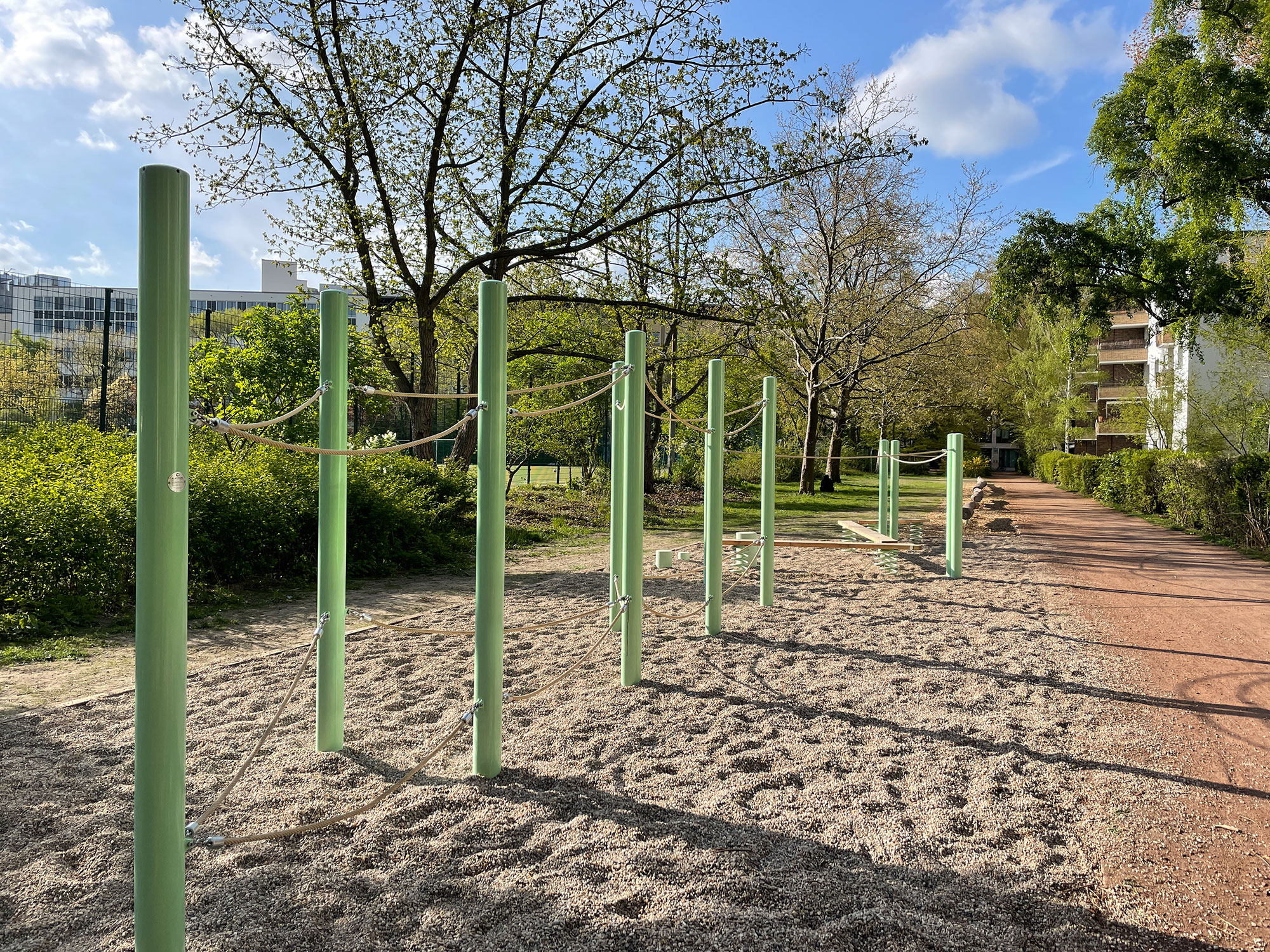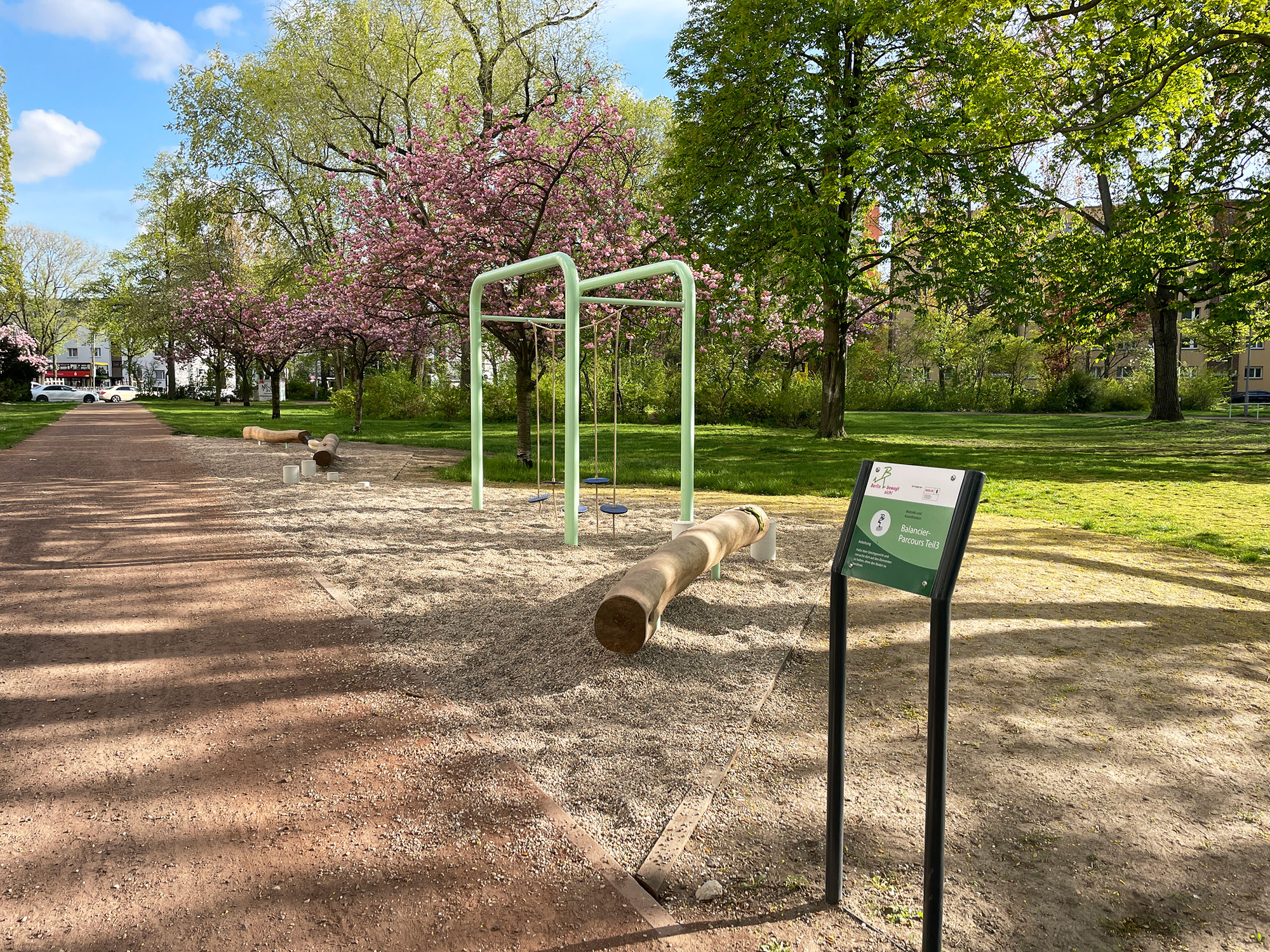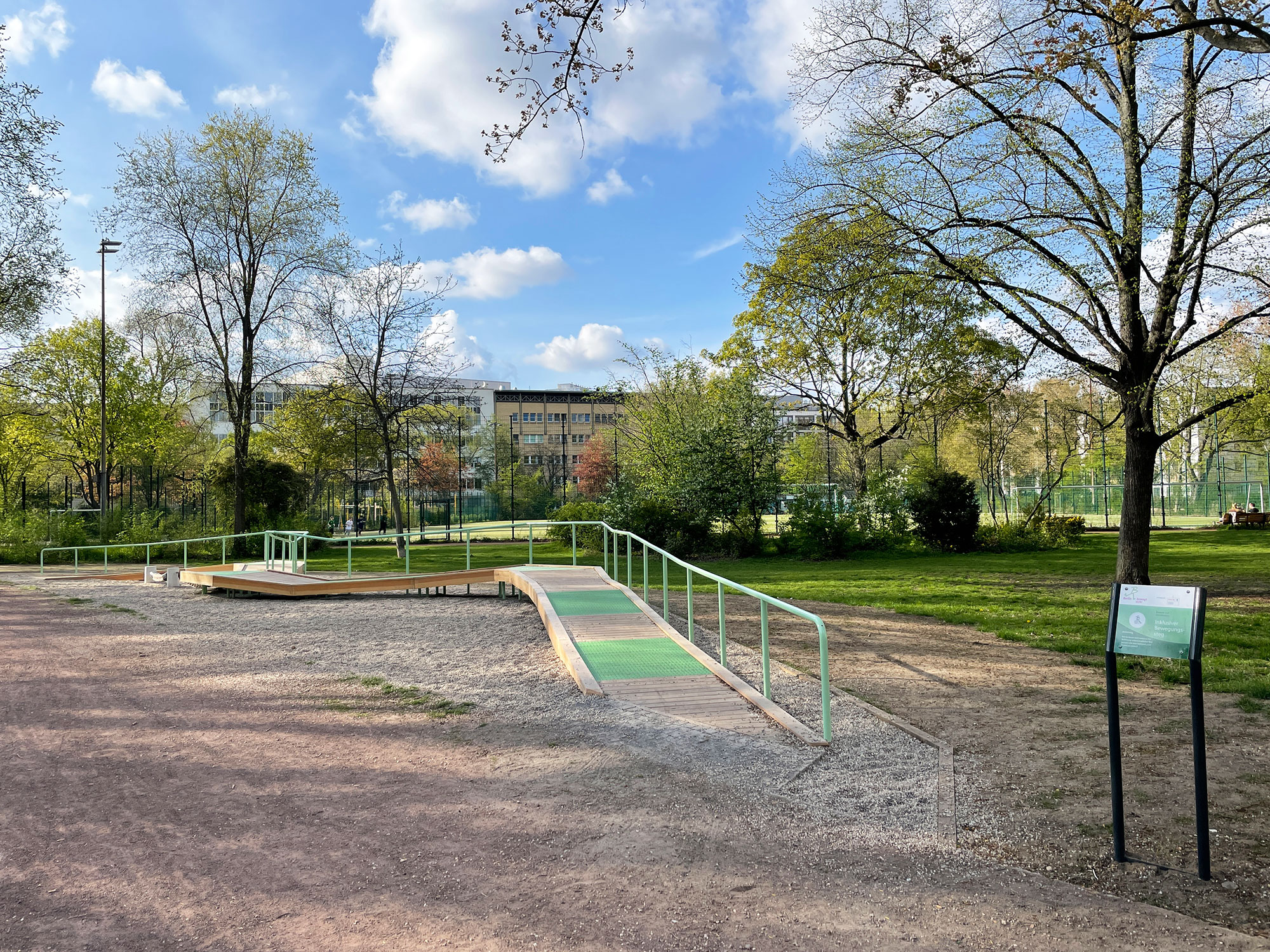 Für den Waldeckpark bestand der Wunsch, die bereits vorhandenen Spielzonen im Park um Balancier-Elemente zu ergänzen. Hierfür haben wir Balanciertaue, den Seilzirkus und einfache Robinienstämme an ausgewählte Standorte verteilt, die an den umlaufenden Weg angelegt sind. Ein inklusiver Steg mit abwechselnden Oberflächen und Neigungen bietet Übungsmöglichkeiten für Menschen mit Behinderung an.