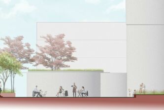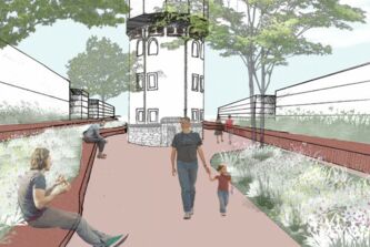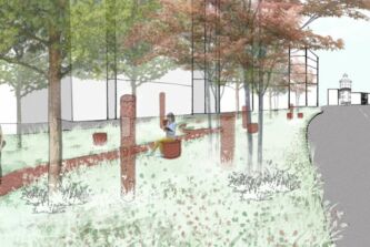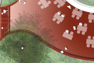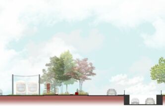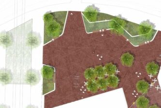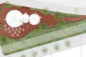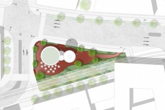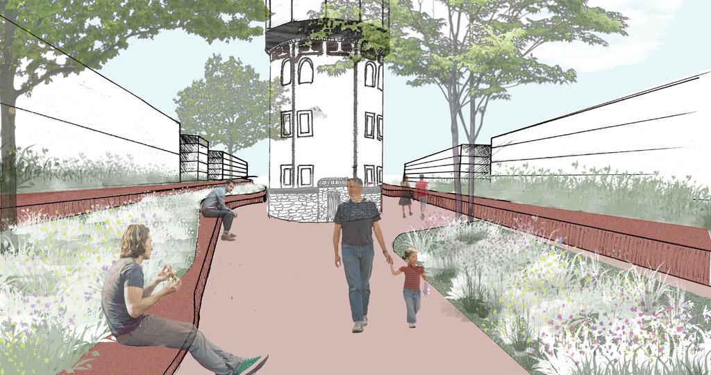 Die südlich entlang der Grünen Meile verlaufende Straßenbahnlinie wird im Bereich des Wasserturms in ein grünes Gleis gelegt. Diese Geste wird bis an die Platzflächen rund um den Wasserturm herangezogen. Die Vegetation ändert sich hierbei von Ruderalvegetation im Bereich der Gleisanlage zur intensiv bepflanzten „grünen Raumkante“. Diese umspült den gesamten, annähernd dreieckigen Platzbereich und öffnet sich an den wichtigen Zugängen. Die groß-zügigen Aussensitzbereiche des Restaurants ergänzen die Sitzauflagen an den Mauern, die den Höhensprung der umgebenden Straßen aufnehmen.