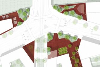 Die das Stadtbild prägende Farbe - rötlich durch den roten Buntsandstein sehen wir hier in der Oberflächengestaltung. Diese wird über den Platz bis in die Kopernikusstraße geführt. Diese bleibt frei von flächigen, vegetativen Elementen und bietet Platz zum Aufenthalt durch das Aufstellen von Sitzen und Bänken in der Straßenmitte. Hier werden auch Funktionen wie das Abstellen von Fahrrädern, Abfallbehältern etc. vorgesehen.