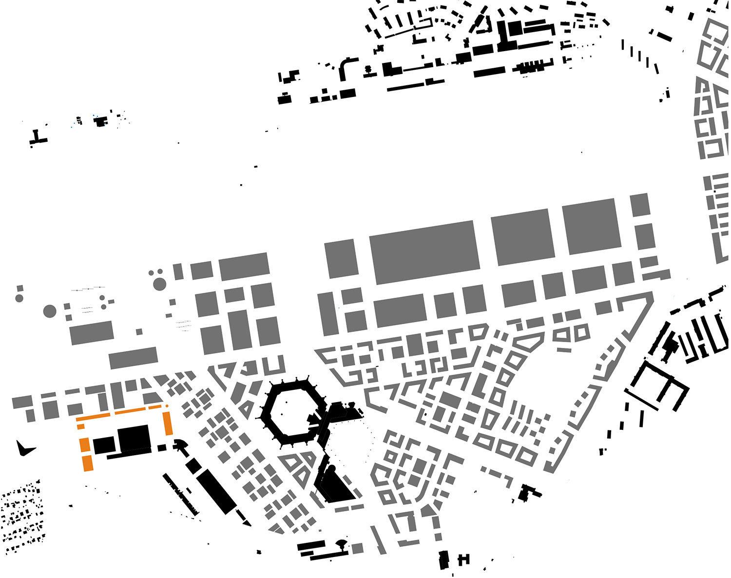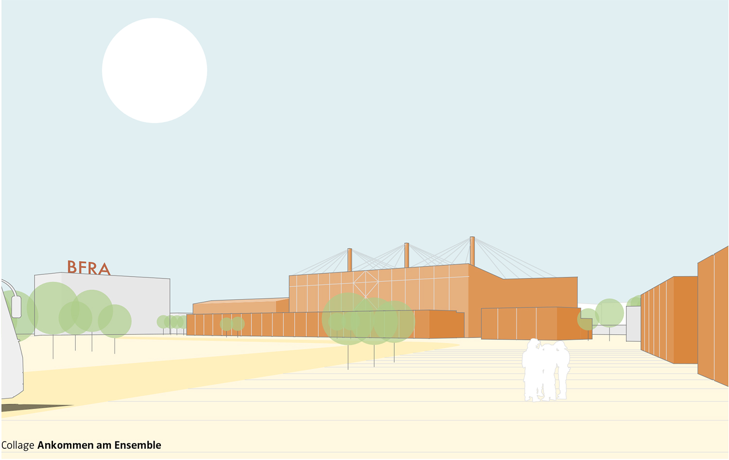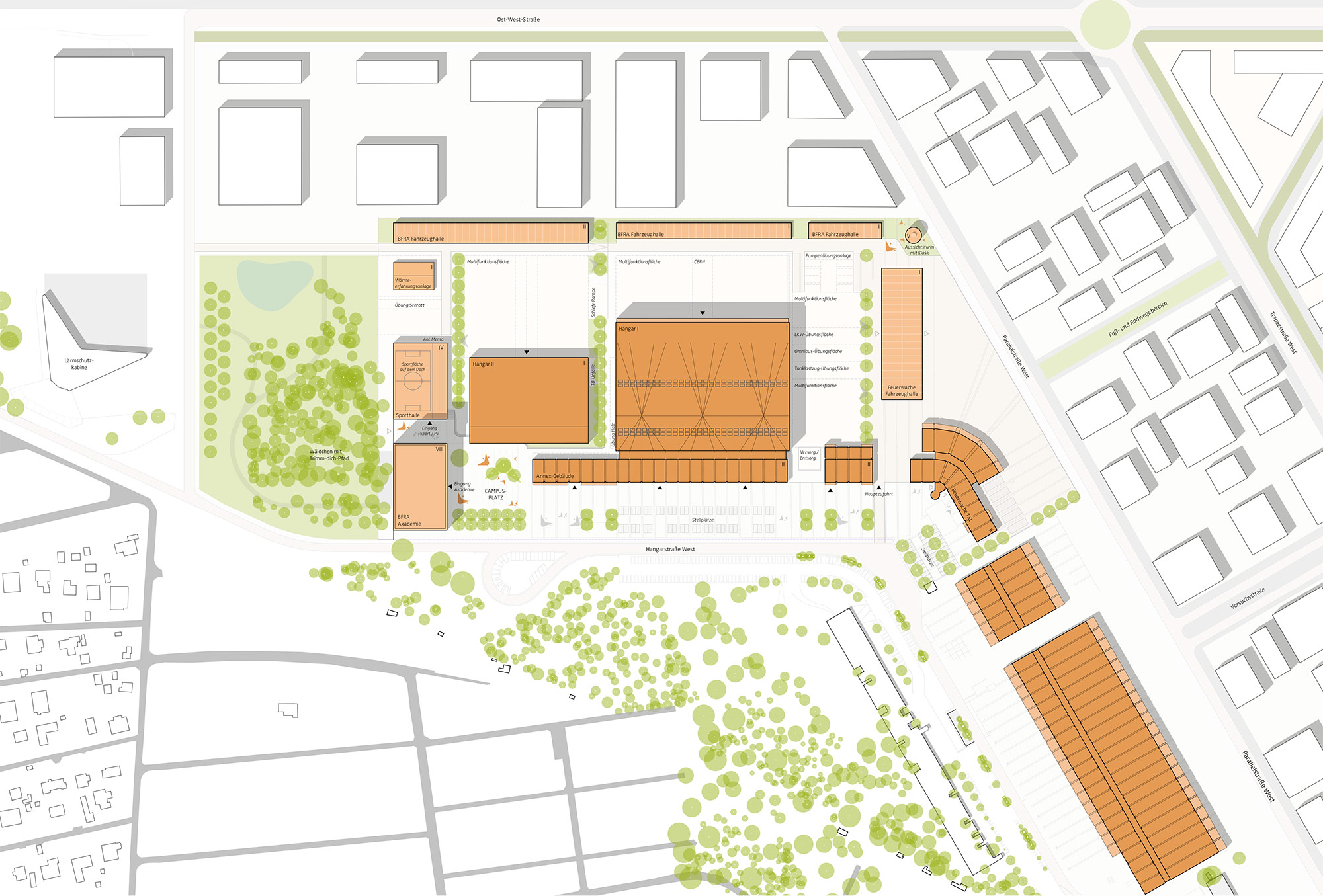 Die städtebauliche Leitidee ist es, die Besonderheit der Gesamtanlage zu stärken und diese rücksichtsvoll und dennoch wahrnehmbar zu ergänzen und abzuschließen. Ein Turm als Ende der Flughafenrandbebauung an der südwestlichen Grundstücksgrenze stellt hierbei den markantesten Baustein dar. Er gibt der linearen und repetitiven Abwicklung der bestehenden Randbebauung einen räumlichen Abschluss und erzeugt durch den Kontrast zwischen Horizontale und Vertikale eine volumetrische Spannung, die die Besonderheit der bestehenden Bandstruktur hervorhebt. Im gleichen Zuge erzeugt die städtebauliche Setzung eine eindeutige und eigenständige Adresse mit hohem Wiedererkennungs- und Repräsentationswert: sie stellt durch die Großmaßstäblichkeit eine Verbindung zu den großen Hangarvolumen her. Entlang der nördlichen Grundstücksgrenze ist eine modulare und lineare Randbebauung in Anlehnung an die denkmalgeschützten Annexbauten vorgesehen. Diese dienen ebenso wie die Annexbauten als dienende Einheiten für Hauptflächen – in diesem Fall den großen Übungs- und Multifunktionsbereichen – und schirmen die Fläche nach außen ab.