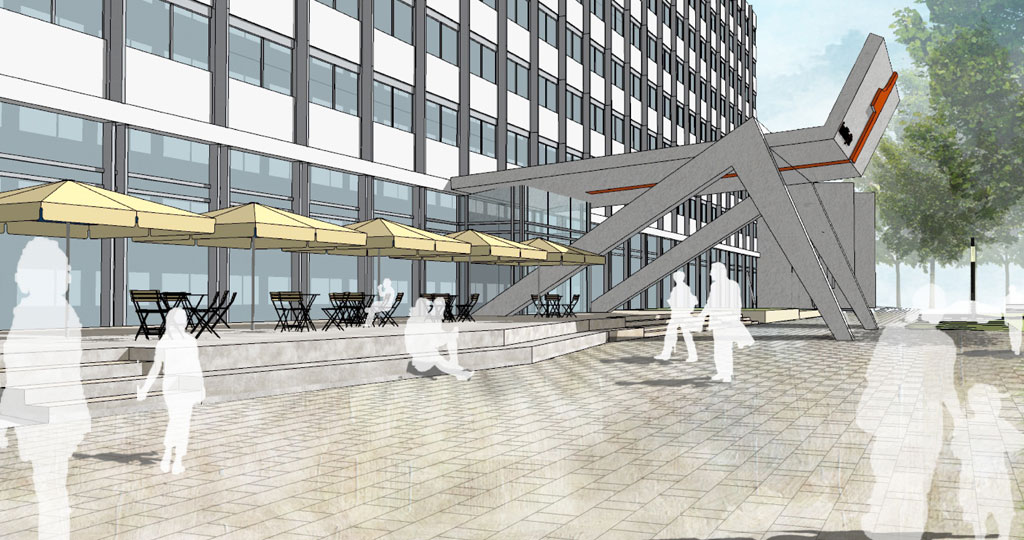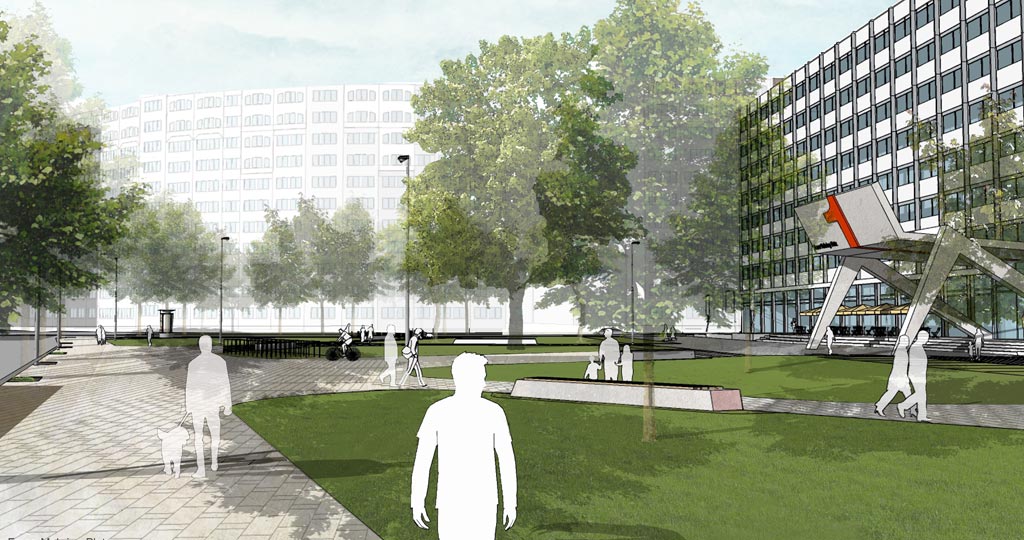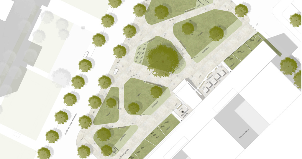 Ziel des vorliegenden Entwurfes ist es, den Franz-Mehring-Platz wieder als erlebbaren und multifunktionalen Platz in das Stadtgefüge einzubinden. Wir stellen uns einen offenen, lebendigen Stadtraum vor, der sowohl die Anforderungen der Nutzer von FMP 1 als auch die Bedürfnisse der Öffentlichkeit gleichermaßen berücksichtigt. Ein offener Raum für Alle!