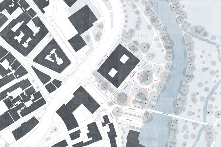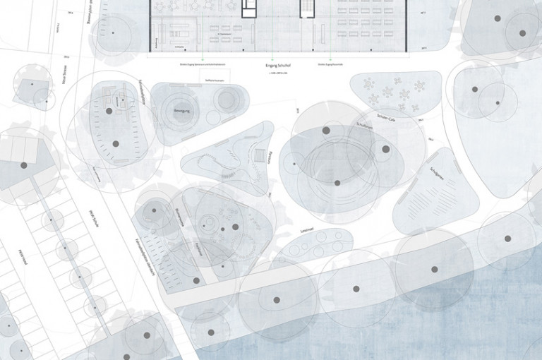 Die Schule als Solitär steht inmitten des Landschaftsraums und wird von Landschaft umspült. Aus der Landschaft entwickeln sich Wege, die den Schulhof durchdringen. Grüne Schollen durchwirken den Schulhof und reflektieren die Landschaft. In die Schollen werden auch Fahrradstellplätze, Schulgärten und Sitzmöglichkeiten integriert. Die Bestandsbäume bleiben weitestgehend erhalten.