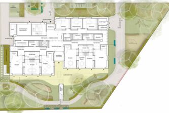 Auf der westlichen Grundstücksseite öffnet sich eine großzügige Rasenfläche als Experimentierbereich sowie ein Bereich mit Fallschutzkies für z.B. eine große Schaukel. Im Teil südlich der neuen Kita befindet sich ein Wasser-Matsch Bereich. Im südwestlichen Bereich schließt sich ein kleiner Hügel zum Chillen und Ausruhen an.