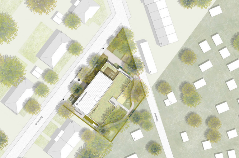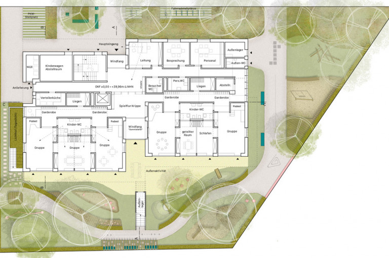 Der Freiraum gliedert sich in Bereiche für die Krippenkinder (0-3 Jahren) und den Kindern der Altersgruppe 3-6 Jahre. Die Gruppenräume der 0-3 jährigen Kinder befinden sich im Erdgeschoss. Diese öffnen sich nach Süden, wo sich auch die Spielzonen anschließen. Flächen aus EPDM (Kunststoffbelag) und Rasenflächen gliedern diesen Bereich. Sandspiel, Nestschaukel und leichte Topografie bieten den Kindern Raum für Bewegung und Spiel.