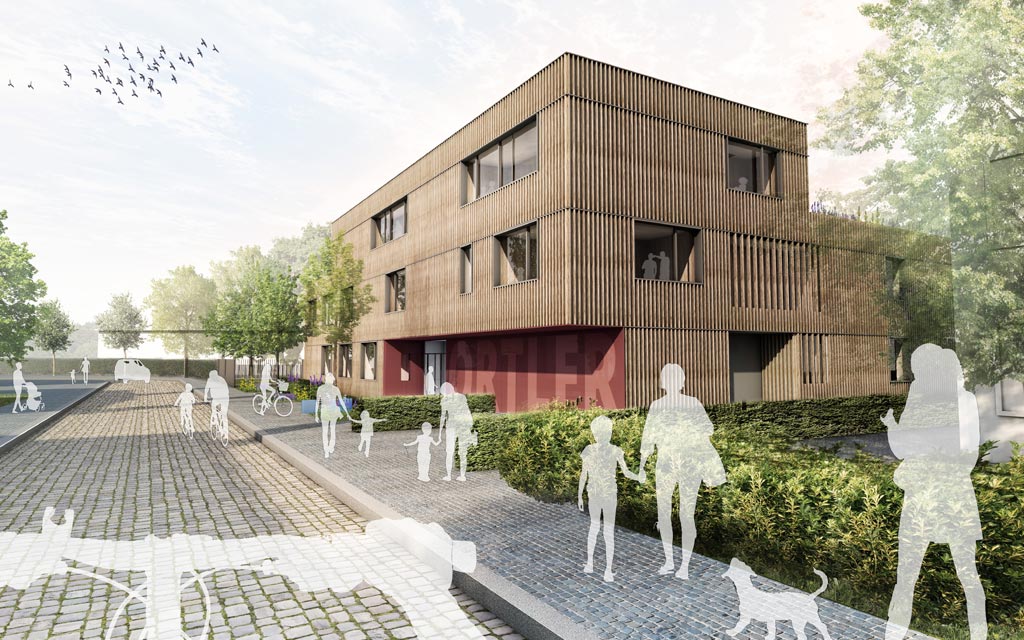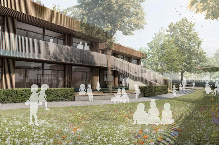 Im Bereich der Freifläche südlich der Außentreppe entsteht ein „überdachter“ Bereich mit einer Pergola mit Spielwand und Sitzbänken, der sowohl zum Spielen einlädt, als auch die Möglichkeit für die Erzieher*innen bietet, die Aufsicht über die Kinder uneingeschränkt zu gewährleisten.