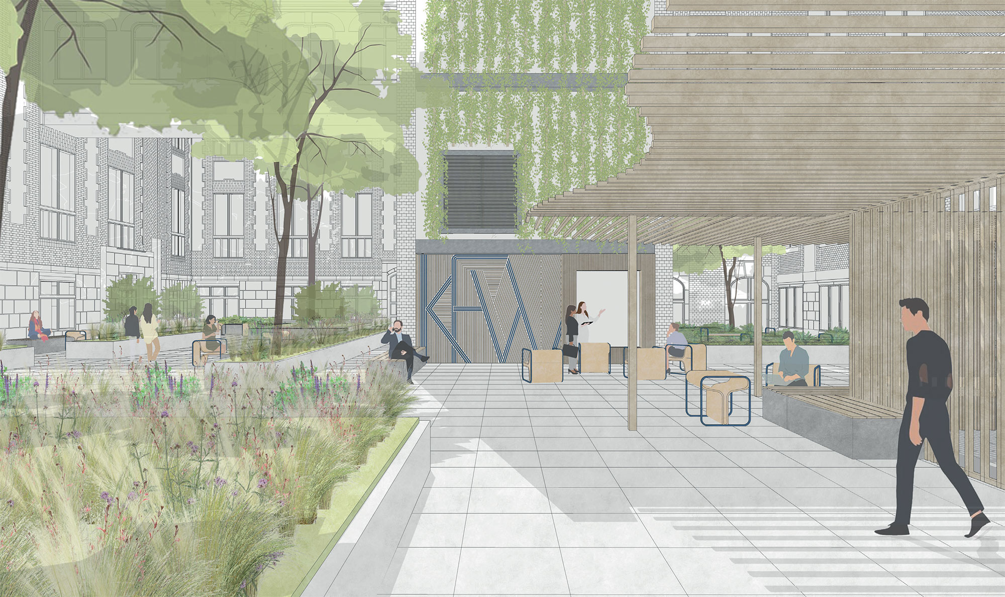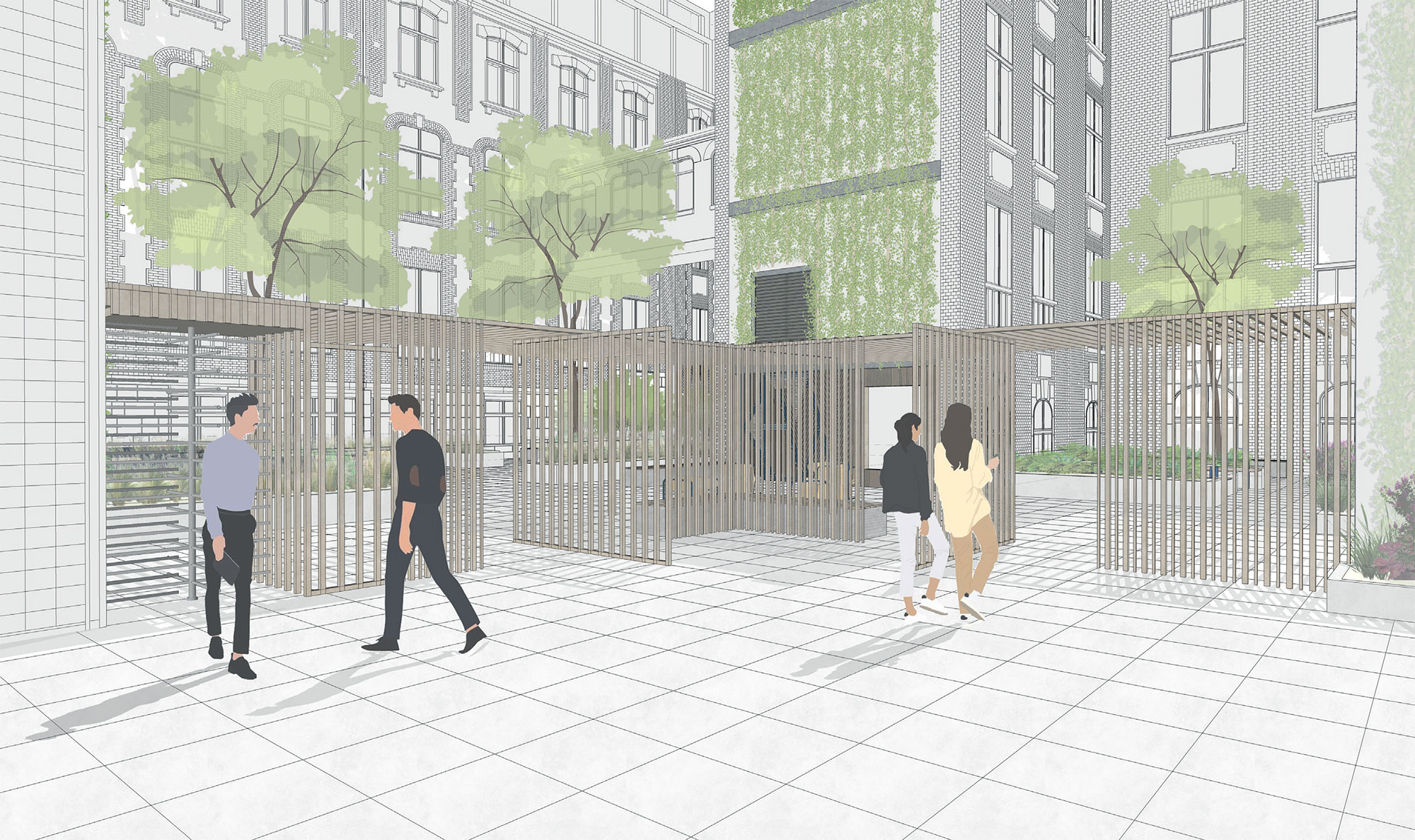 Die Neugestaltung des Innenhofs sieht eine Teilung des Hofes in einen Wirtschaftshof (Anlieferung, Stellplätze PKW und Fahrrad) und einen „gesicherten“ Bereich vor. Zur Teilung des Raumes wird eine Raumgrenze an den Gebäudefluchten hergestellt. Die Raumgrenze wird allerdings so flexibel gestaltet, dass bei Veranstaltungen, diese geöffnet werden kann und so eine Verbindung zwischen Wirtschaftshof und „gesicherten“ Bereich hergestellt werden kann.