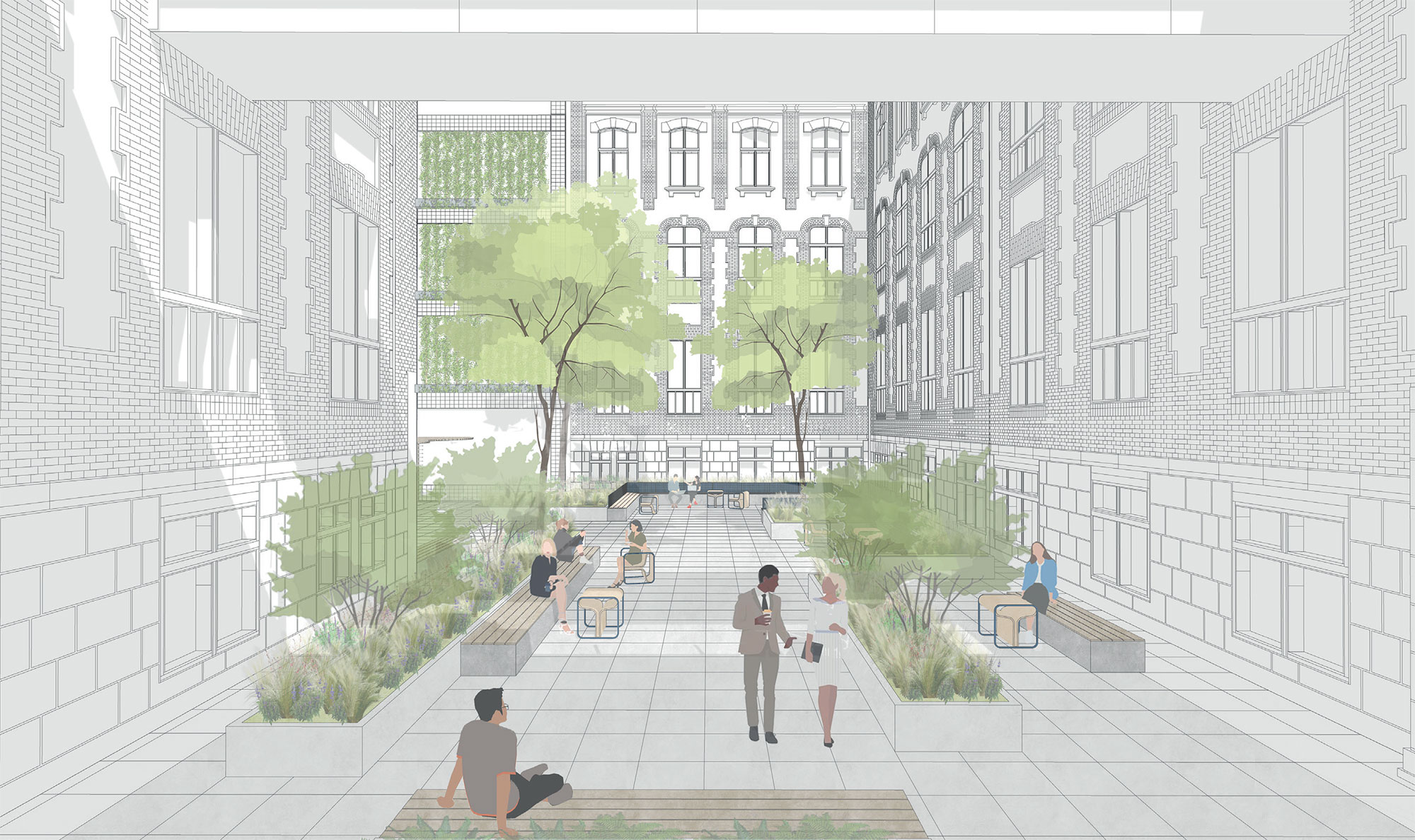 Grundsätzlich soll die neugeordnete Innenhoffläche in Teilbereiche mit verschiedenen Nutzungsschwerpunkten eingeteilt werden. Neben einem großzügigen Entrée mit Aufenthaltsbereichen, Raucherbereich und einer repräsentativen Präsentationsfläche an der Nordfassade beinhaltet die Neugestaltung des Innenhofs auch die Herstellung eines offenen Workspace sowie einer Lounge für den Aufenthalt.