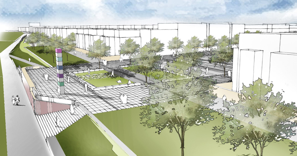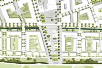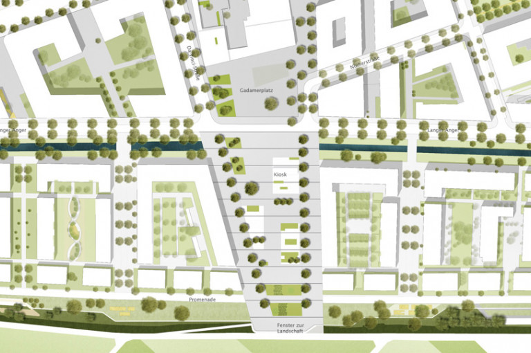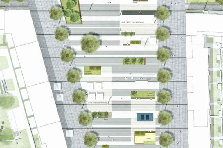 Durch den Entwurf wird ein neuer und klar urban geprägter Stadtraum entwickelt. Fließende Übergänge der unterschiedlichen Nutzungen schaffen eine Kontinuität der Teilräume.