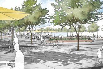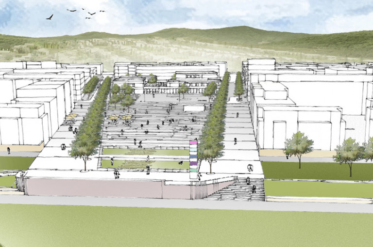 Die Mischnutzng der Platzrandbebauung spiegelt sich in der Nutzungsverteilung auf dem Platz wieder. Flächen für die Außengastronomie im Westen werden im östlichen Platzbereich durch Flächen für Spiel ergänzt. Im nördlichen Platzbereich schlagen wir ein Pavillon vor, der ein Kiosk, ein öffentliches WC und eine Fahrradstation aufnehmen kann. Auf dem Stadtbalkon steht eine Infostele, gleichsam als Lichtskulptur und Landmark. Der Stadtbalkon wird als Fenster in die Landschaft in Szene gesetzt.