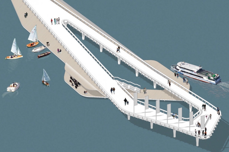 In Form und Gestalt ist die neue MARITIM Seebrücke mit ihren zwei dynamisch geschwungenen Stegen an das Sinnbild eines klassischen seemännischen Knoten angelehnt. Unterschiedliche starke Tampen/Taue ungleichen Materials, teils eng in einander Verschlungen, bilden klar ablesbare Kombinationen/Formen von Buchten, Augen sowie Rundtörns und bilden differenzierte Nutzungsbereiche, die den Anforderungen einer attraktiven, vielseitigen und zeitgemäßen Seebrücke gerecht werden.