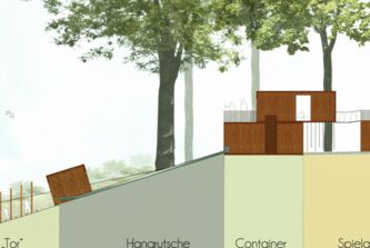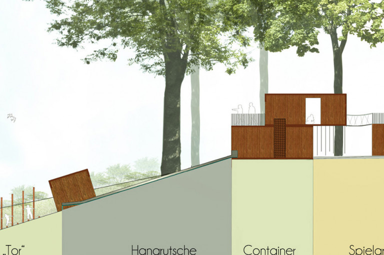 Die Nähe zum Hafen in Kiel sowie die Nutzung des Geländes für den Kiesabbau stellen die Motive, mit denen wir Bezug auf den Ort nehmen und die das Gelände spielerisch überlagern. Umgebaute Schiffscontainer dienen als Gestaltungsmittel, sei es als „Tor“ ins Gelände, gestapelt und verwoben als Spielelement am Hang oder auch als Kletterobjekt wieder.