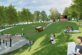 Spielhügel, die sich wie Kieshaufwerke erheben, Rutschen, die wie Förderbänder verbinden…