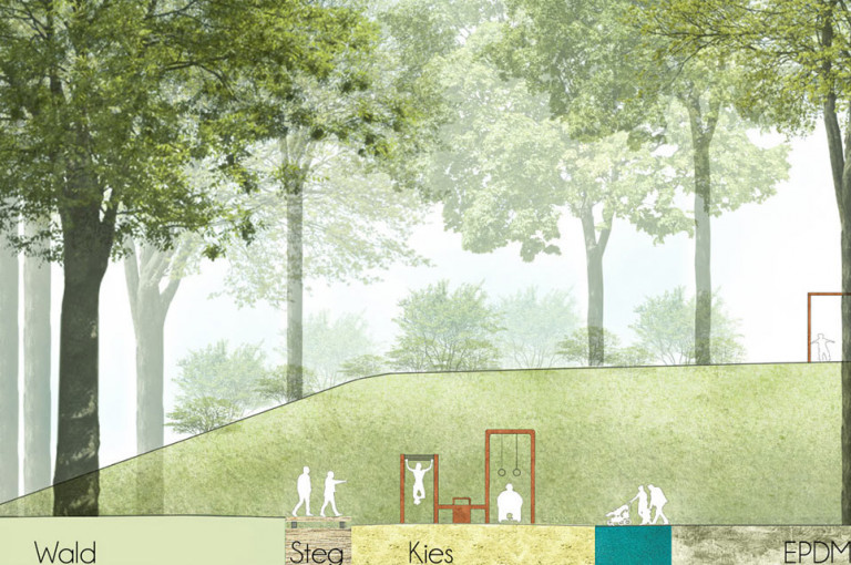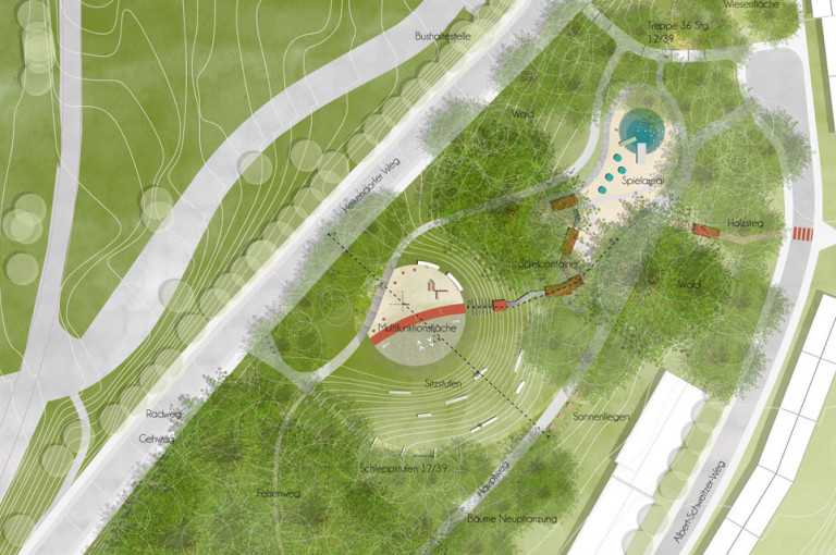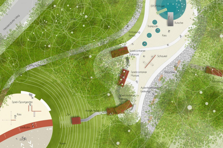 Ziel des vorliegenden Entwurfes ist es, die vorhandenen räumlichen Qualitäten freizulegen und zu steigern, den Ort besser in die Umgebung zu vernetzen und den Bewohnern der angrenzenden Quartiere einen Begegnungsraum zu bieten, der für die Bewohner der umliegenden Quartiere identitätsstiftend wirkt und Kinder aller Altersstufen dazu animiert, diesen Ort für sich zu entdecken.