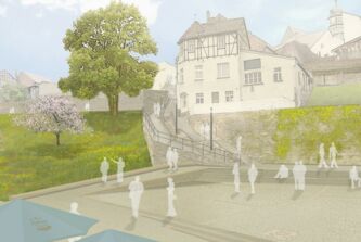 Der neue Mühlenplatz bildet das Scharnier am Fuß der Altstadt. Der Platz vermittelt zwischen dem Niveau der Pfortentreppe, sowie der neuen Platzkante im Osten mit zwei- bis dreigeschossigen Stadthäusern.
