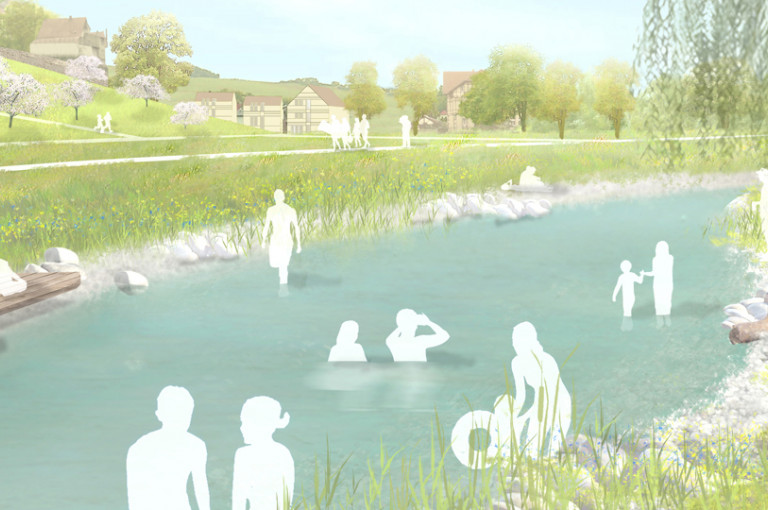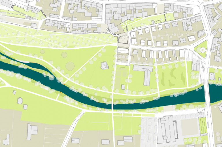 Die Ulsteraue wird auf der gesamten Länge sensibel gestaltet. Begleitende Uferege machen die Ulster erlebbar. Darüber hinaus ermöglichen punktuelle Räume ein Verweilen am Wasser (Stadtterrasse am Kulturforum), die Querung des Wassers (neue Brücke zum Kulturforum) oder den Zutritt zum Wasser (Stege in den Uferwiesen).
